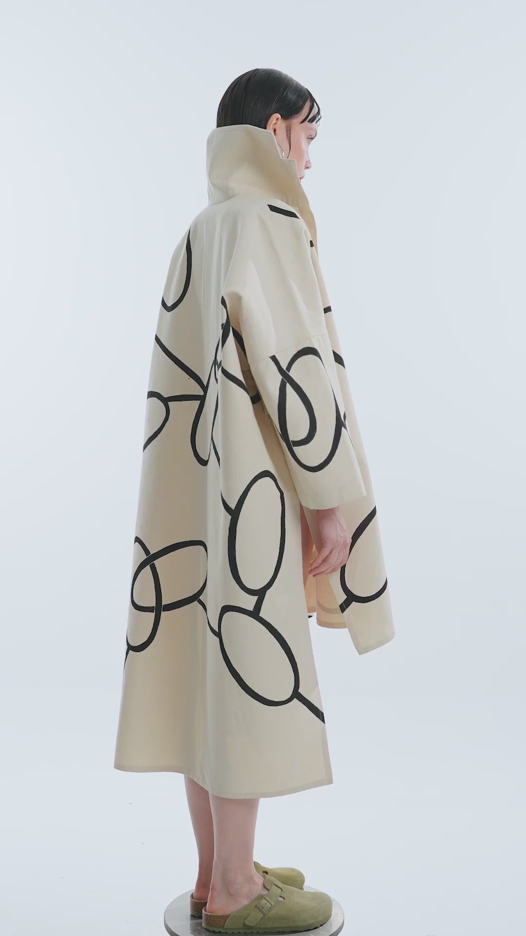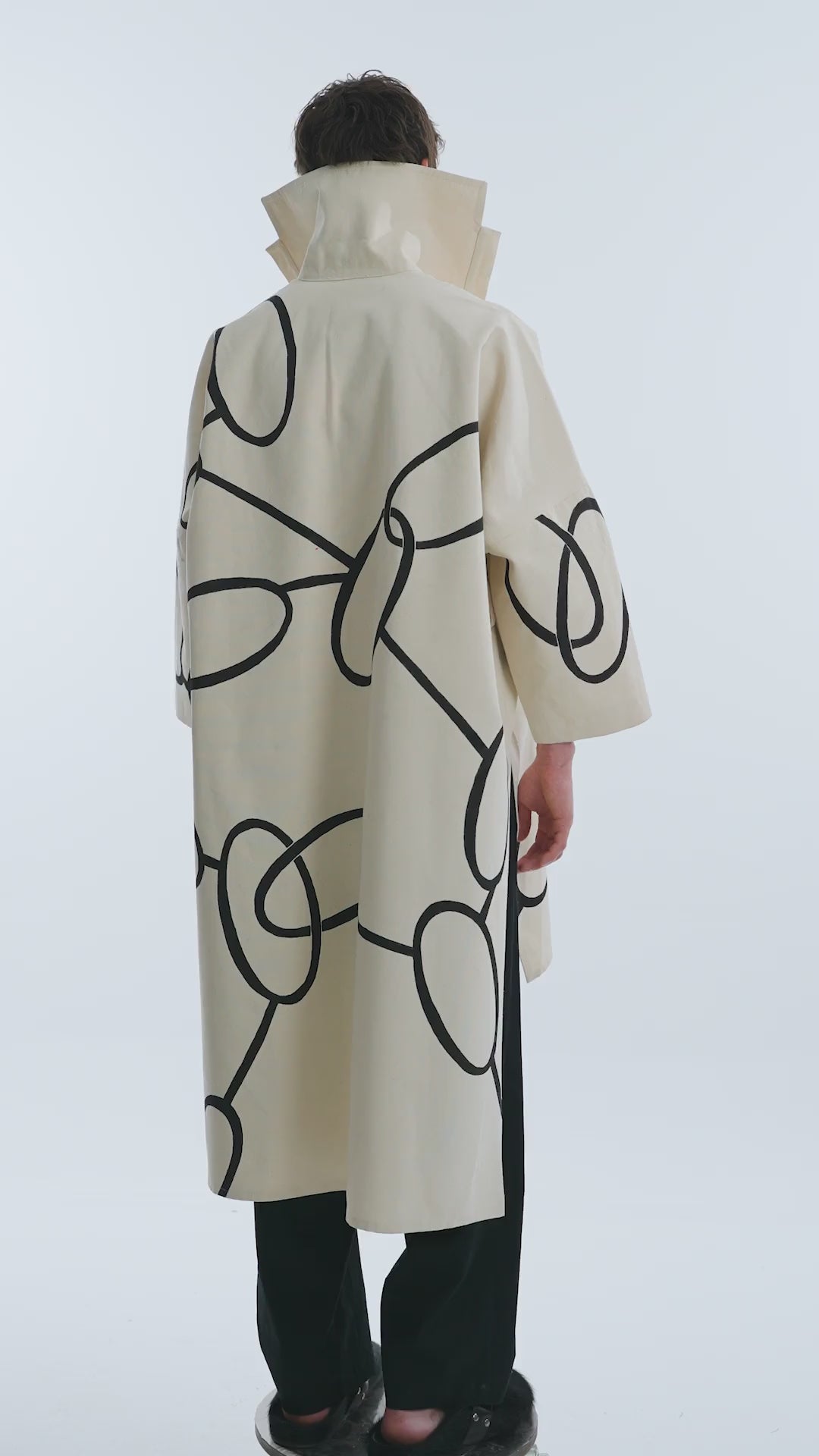 - Classic shawl collar, printed triangle pattern, long sleeves, short at the front, long at the back, oversize, raw canvas midi length unisex kaftan.
