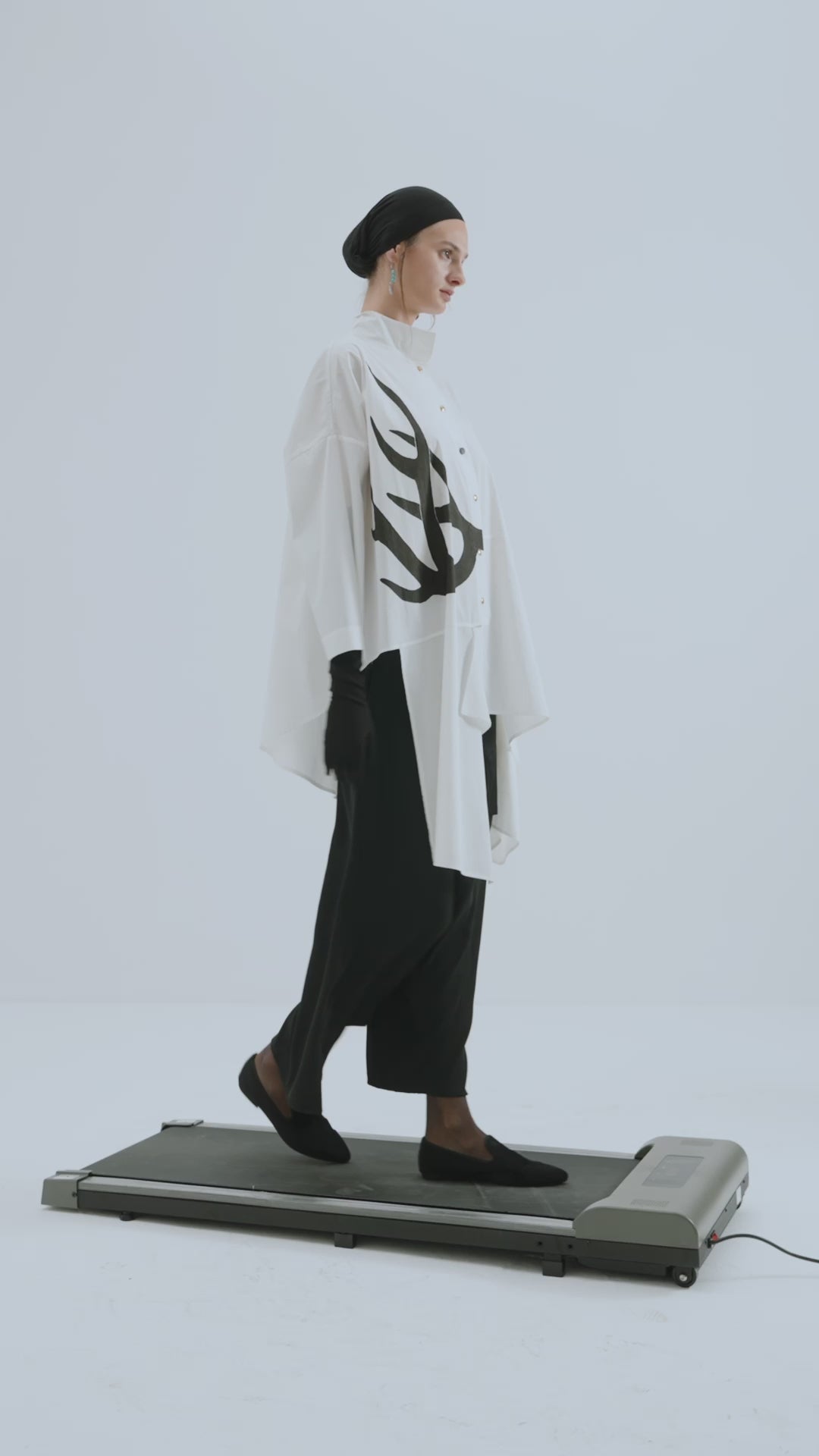 - High collar, oversize, asymmetric cut, woven poplin shirt with a black hand-painted deer horn pattern on one side of the front, snap button closure in the front.