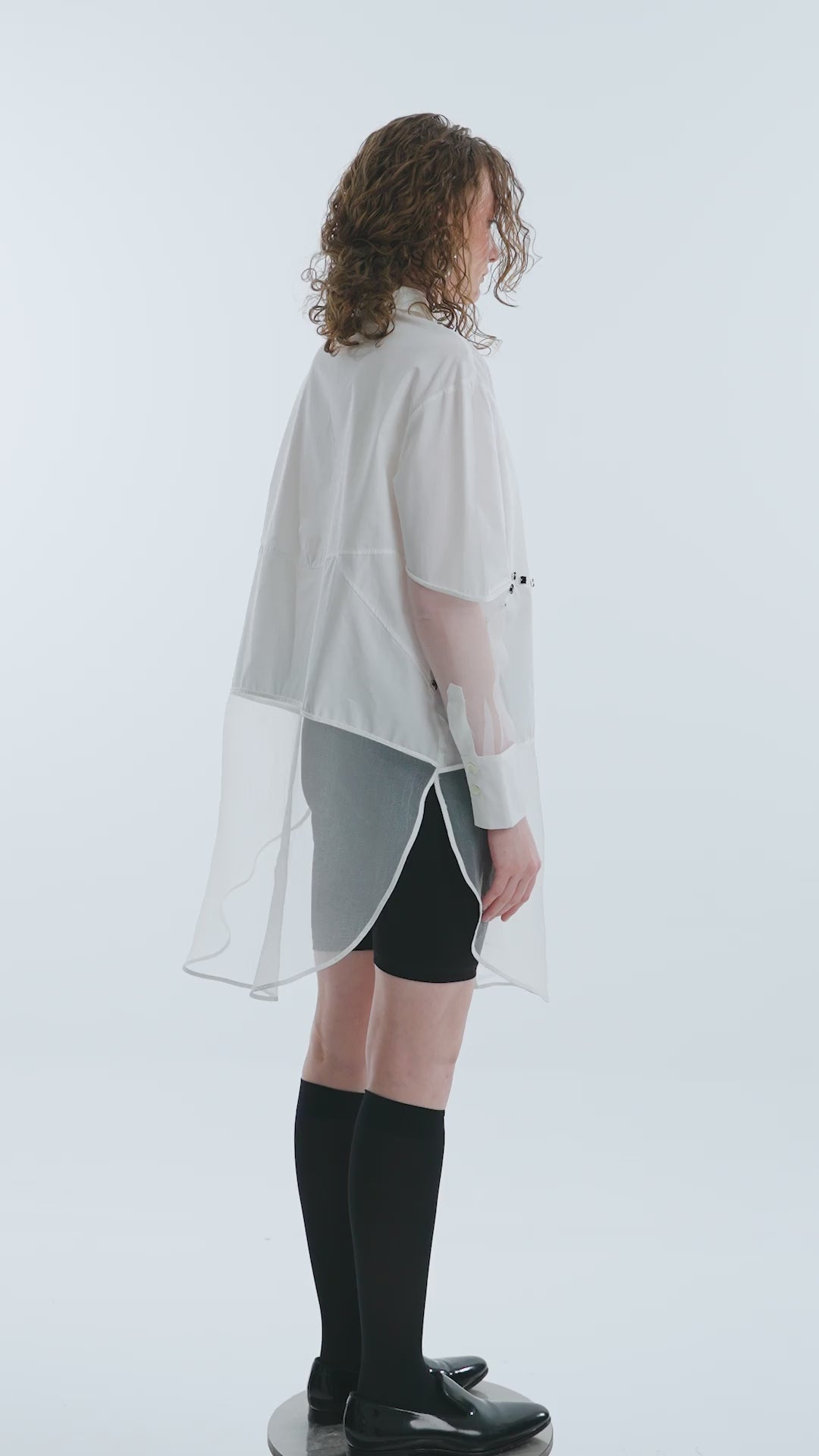 - Classic collar, poplin fabric up to the waist and elbows, organza fabric from the waist and below the elbows, poplin cuffs, button-down front, two side slits, long sleeves, midi length shirt with black stone embroidery on the waist.