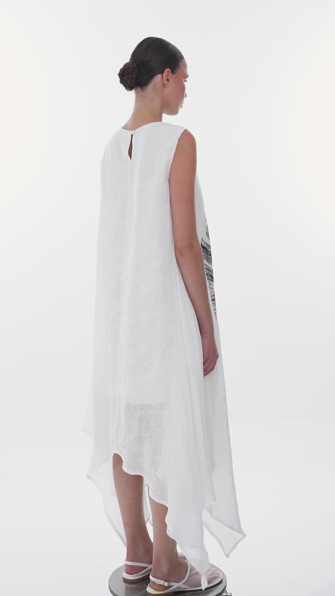 WHITE LEAF PRINTED ASYMMETRIC CUT LINEN MIDI DRESS