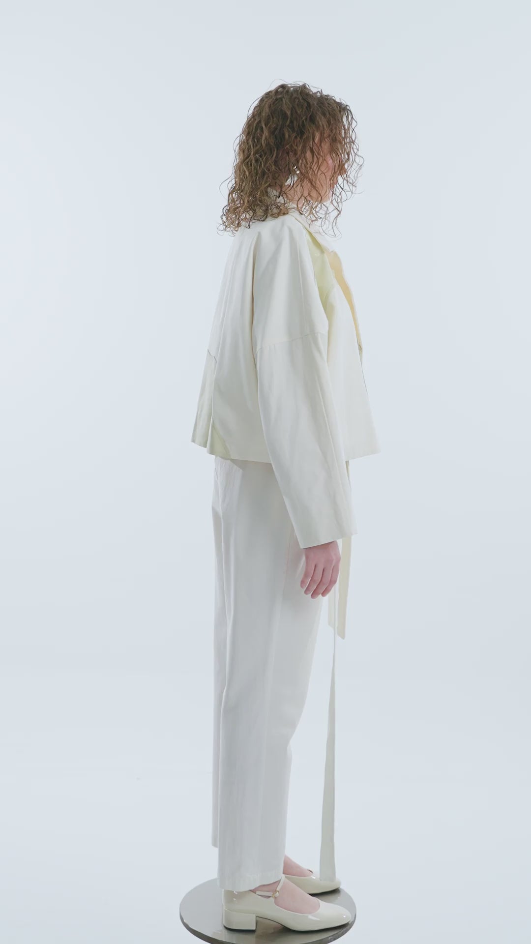 - Single-breasted, oversized, short gabardine jacket with a lapel collar, leather details on the shoulders and front.
