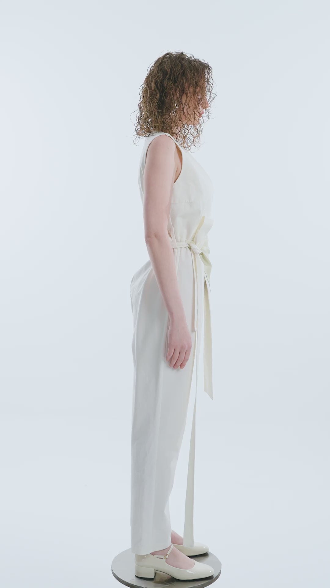 - V-neck, belted, front leather fabric piece detail, sleeveless, back femur closure, gabardine jumpsuit.