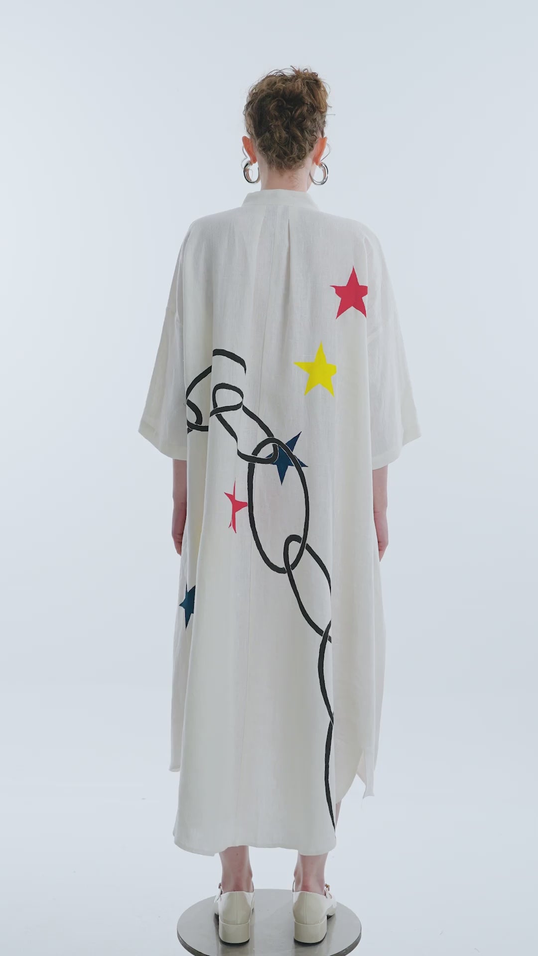 - Asymmetrical cut linen midi dress with a grandad collar, front button closure, three-quarter sleeves, hand-painted patterns.