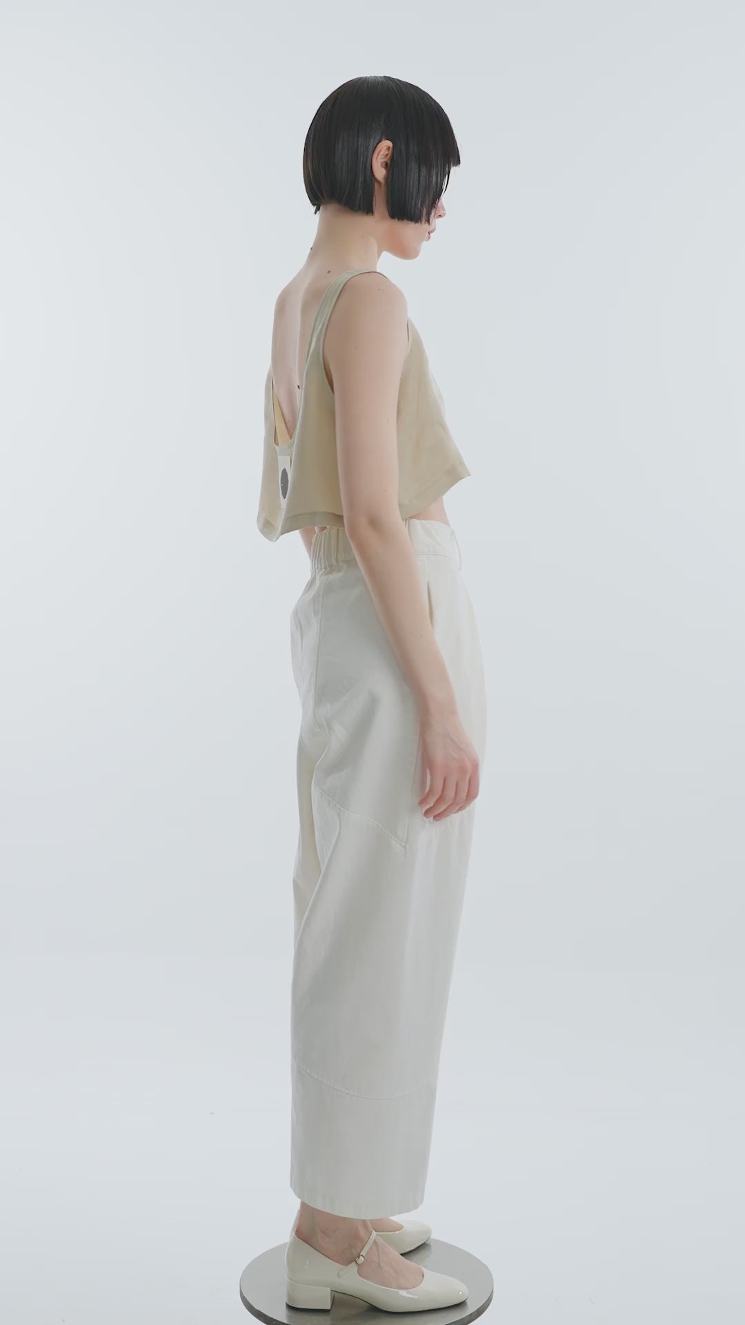 - High waisted gabardine palazzo trousers with elasticated back waist, two side pockets, and stitched detail on the legs and hips.