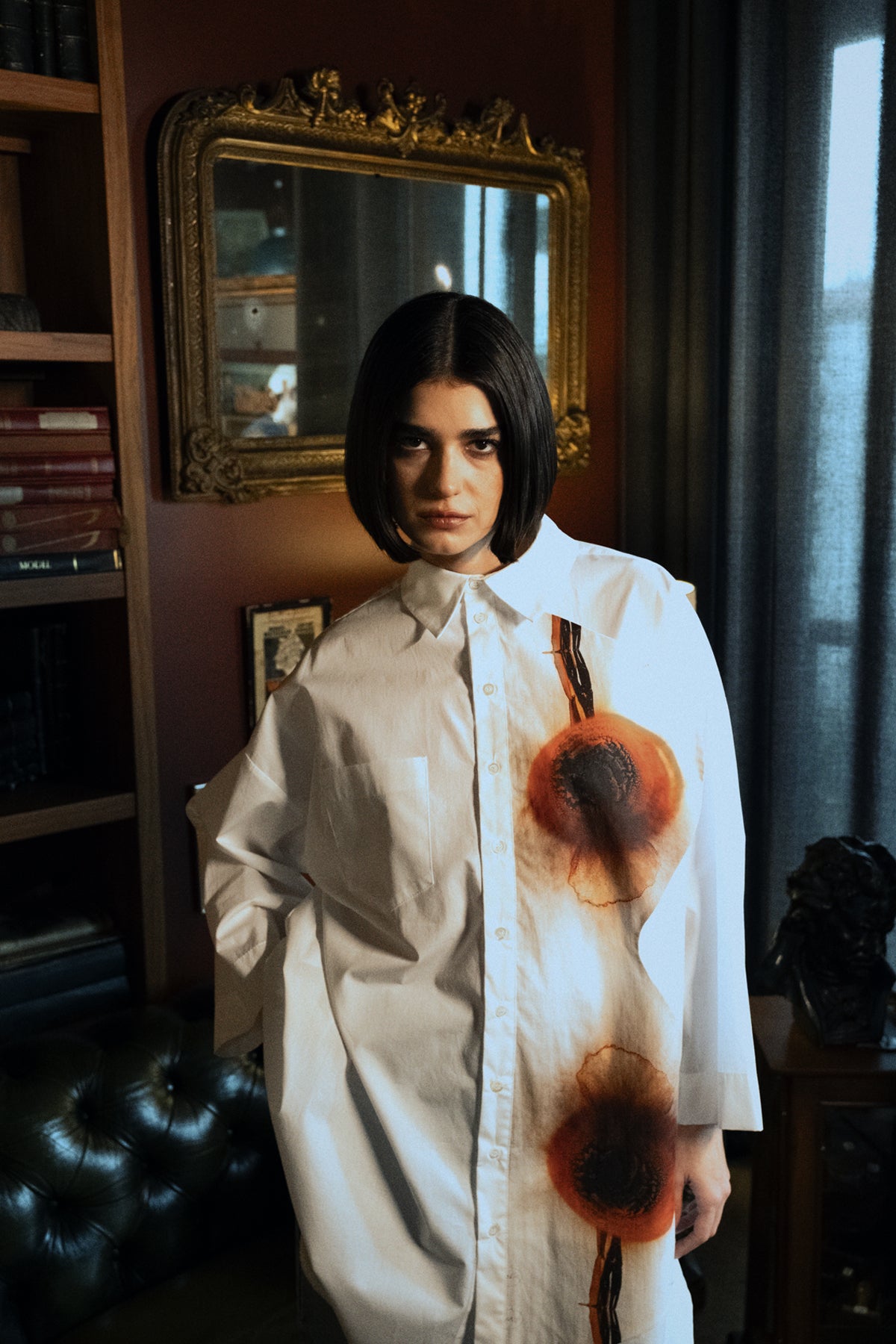 - Classic collar, one side black hand-painted triangle print, front snap closure, cuffless, oversize, back A-pleat, woven poplin fabric, crop shirt.