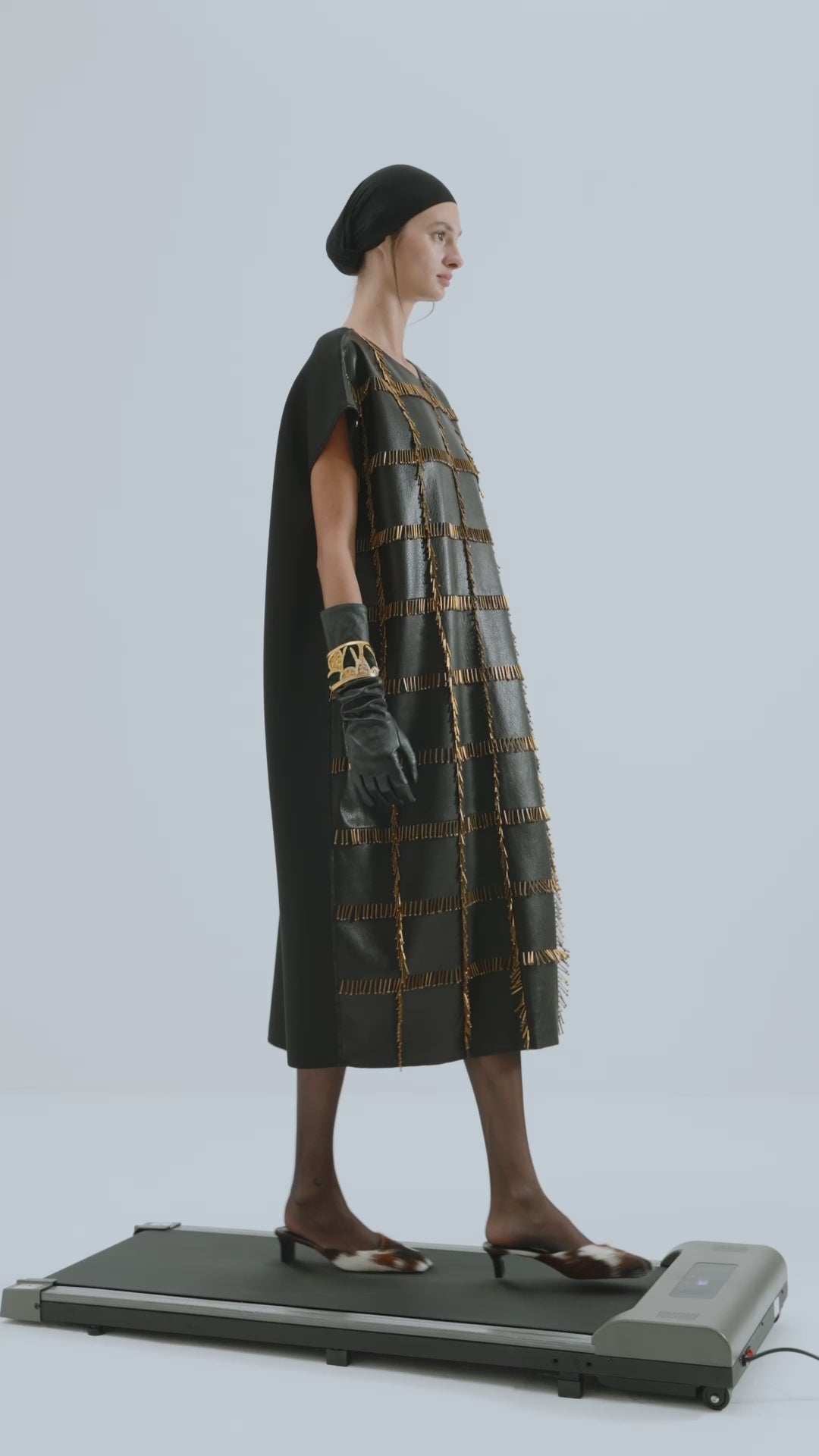 - Round neck, leather and gold bead hand embroidery on the front, scuba fabric on the back, loose cut, back collar snap closure, midi dress.