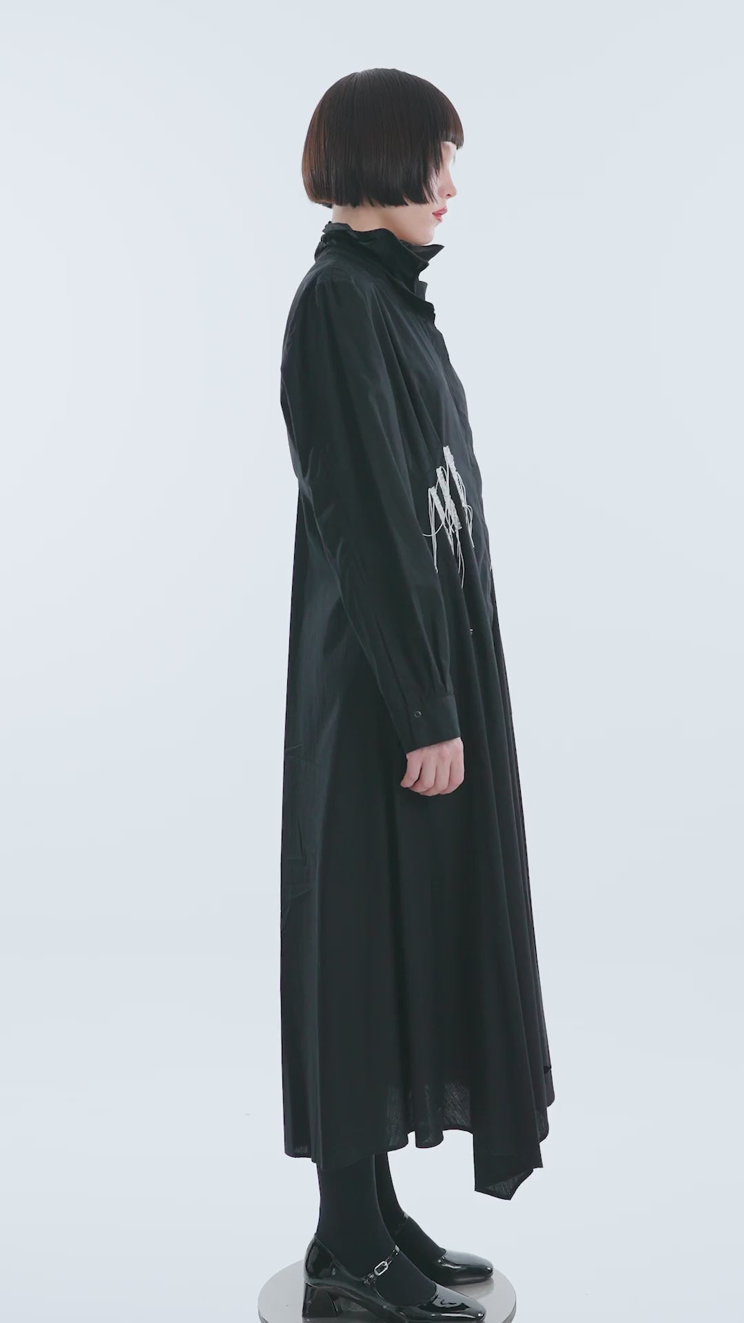 - Poplin shirt dress with a high collar, draped waist, hand-painted stripe pattern and rope detail on the waist, asymmetrical hem, back placket and pleat detail, snap fastening.