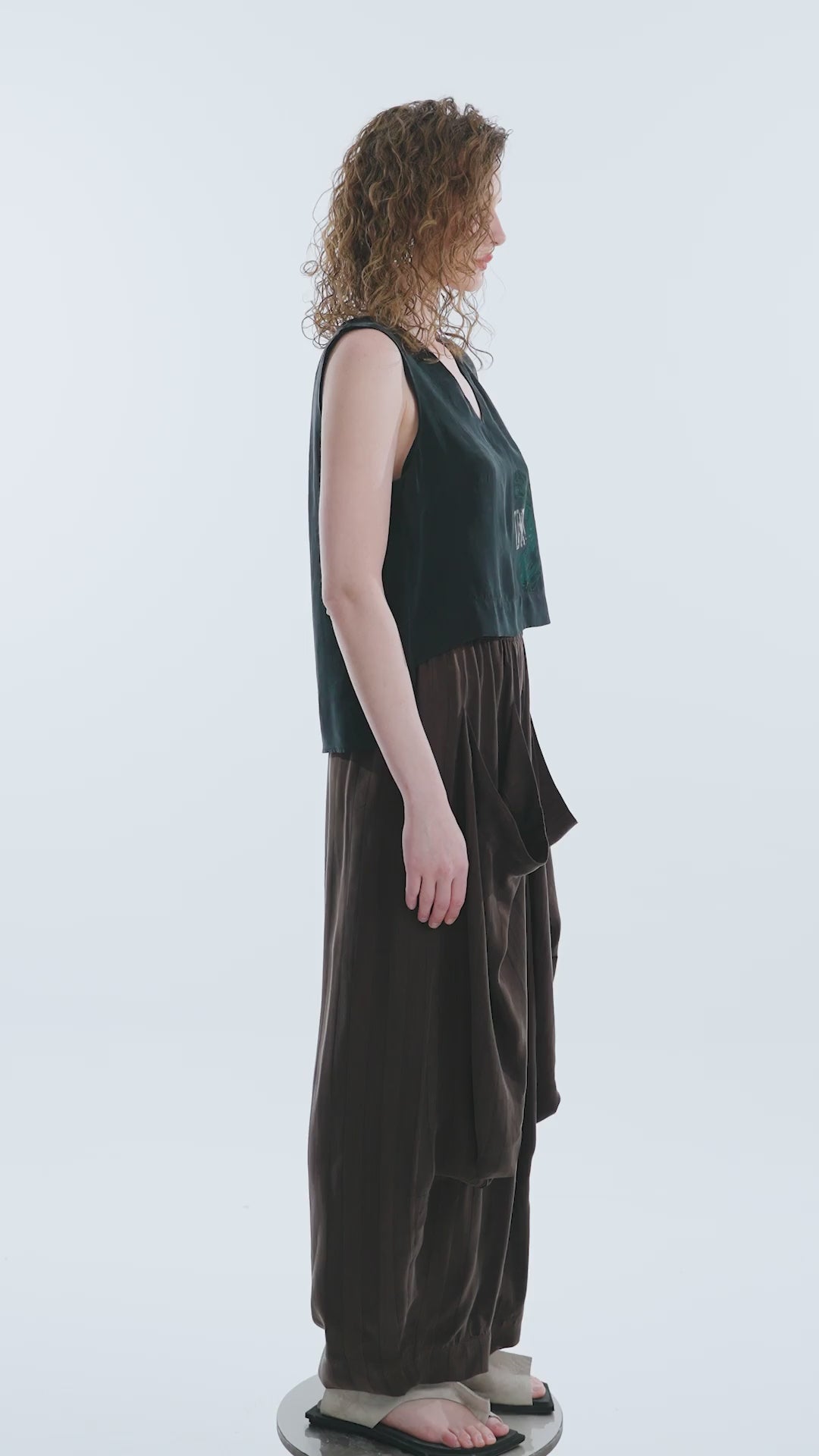 - V-neck, thick straps, shorter front than back, hand-painted pattern on the front, silk-look cupra fabric.
