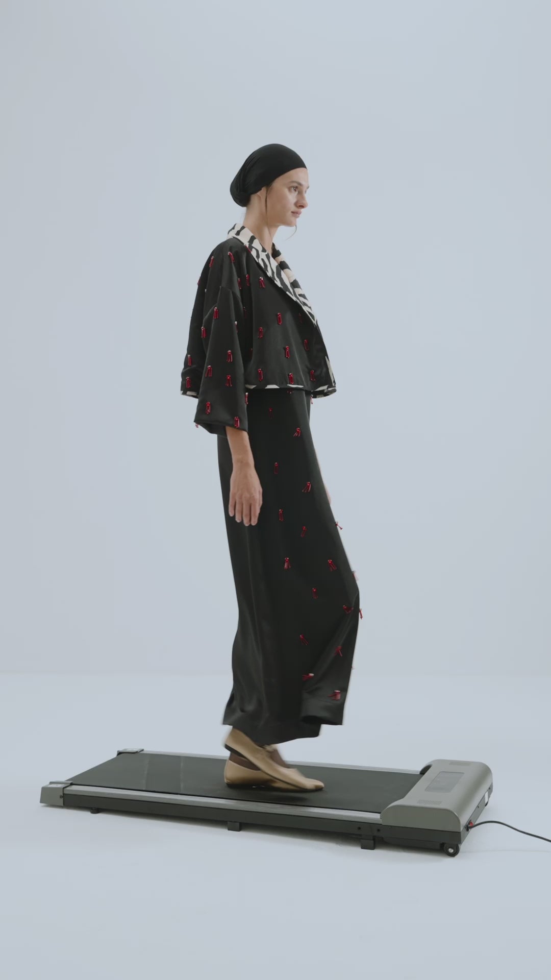 - Turn-down collar, entirely red hand-beaded, satin woven fabric, collar, inside and edges zebra patterned digitally printed poplin fabric, crop jacket.