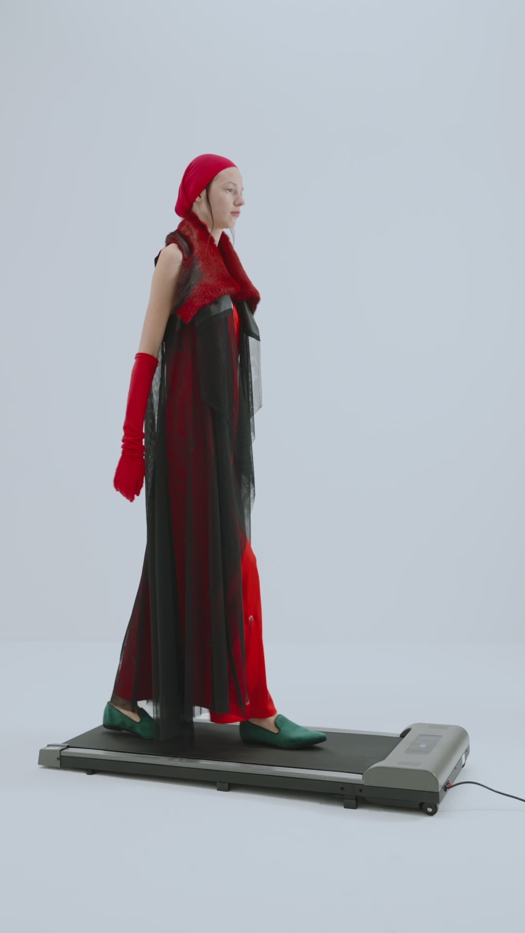 - Wide turn-down collar, red fur collar, leather detail on collar and back shoulder, asymmetrical cut in the front, transparent long tulle vest.
