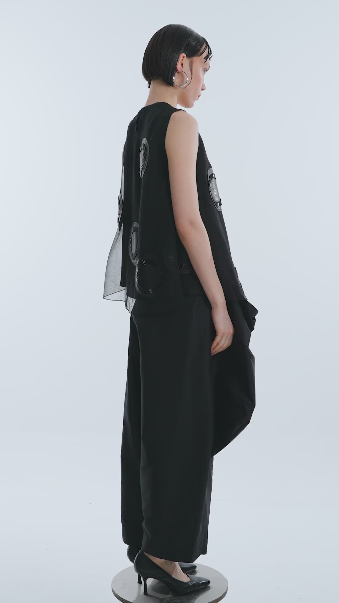 - Round neck, sleeveless, loose-fitting, organza blouse with circular leather appliqués and stone embroidery throughout, lined.