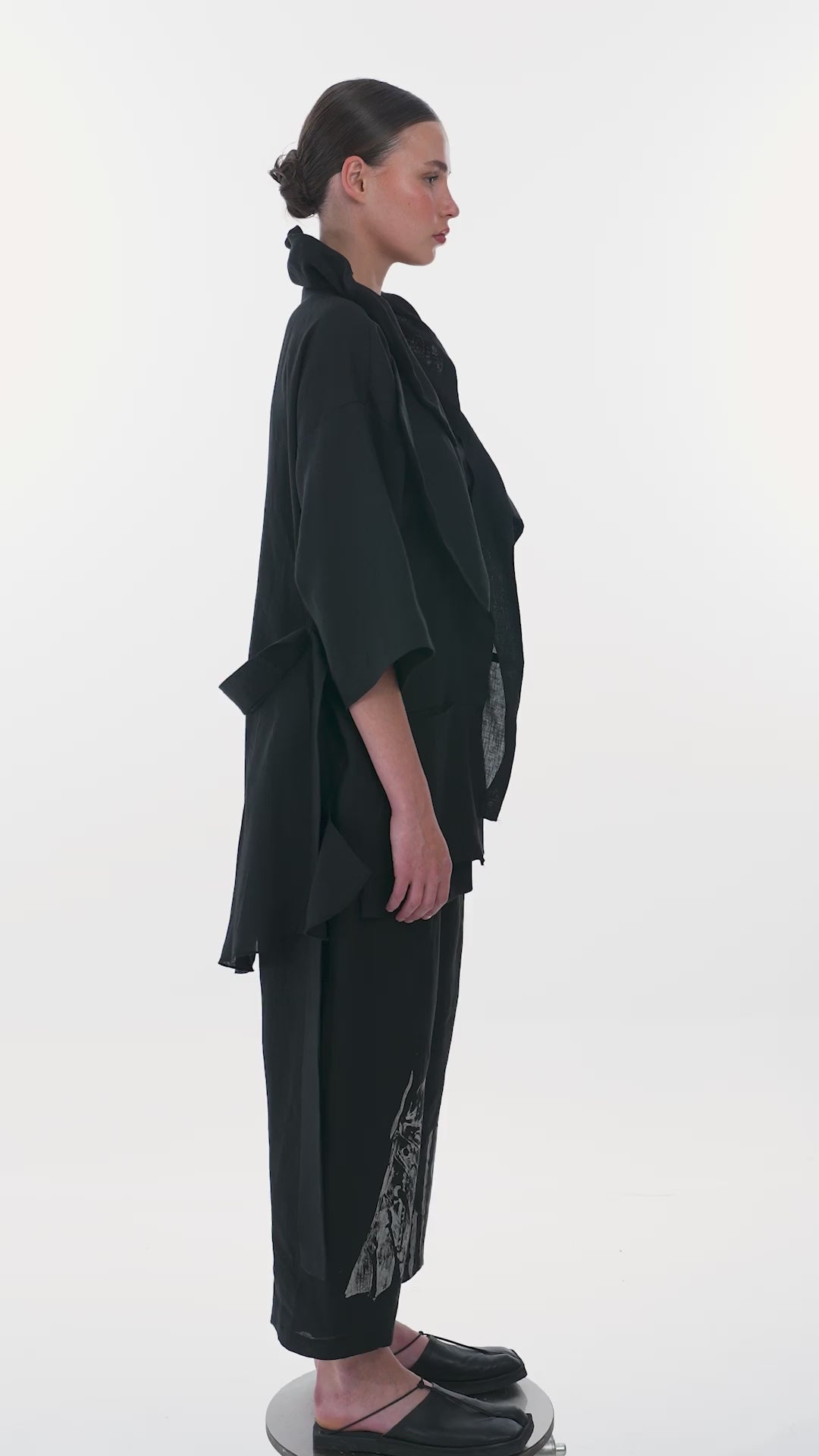 - Shawl collar, leaf pattern designed with original linoleum printing technique on one side of the front, belted waist, three-quarter sleeves, two front pockets, unlined, linen jacket.