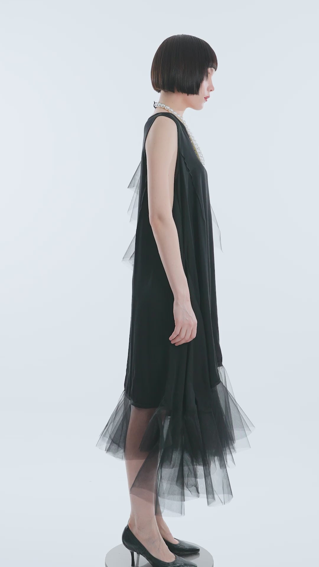- V-neck, sleeveless on one side, short sleeves with tulle detail on the other side, loose cut, midi length dress with ruffled tulle hem.