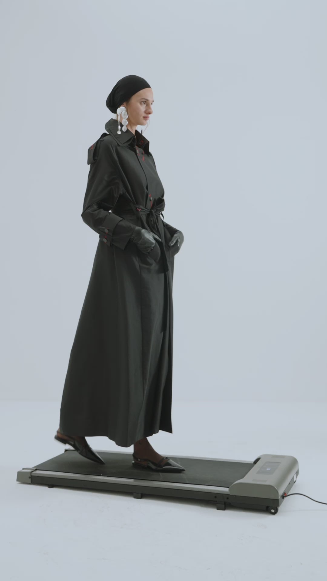 - Long trench coat with a classic collar, removable buttons on the upper collar, double-breasted snap closure, windbreaker on the back, red stitching detail, belt, oversize, pockets on both sides of the front, belts on the cuffs and shoulders.