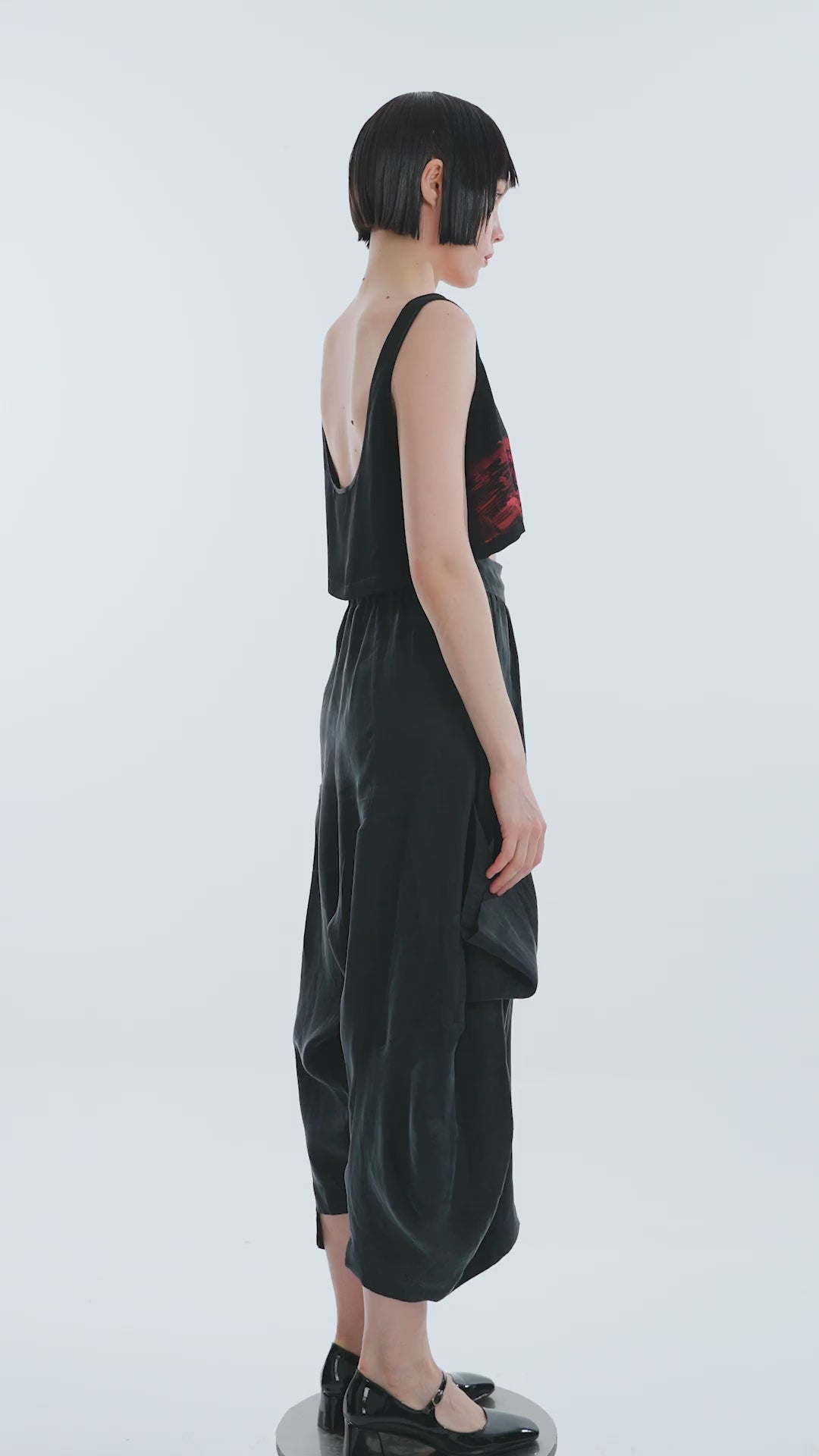 - U-neck, thick straps, loose fit, linocut, satin crop top with Far Eastern calligraphy and ''Happiness'' message on the front.