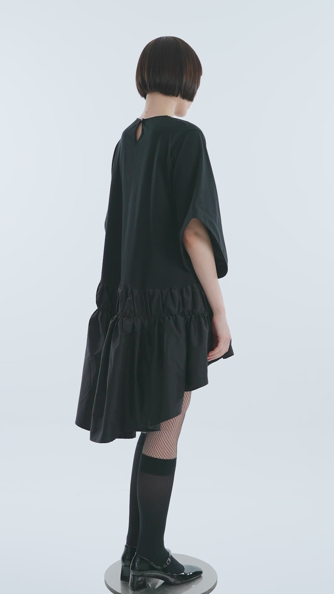 BLACK PARACHUTE FABRIC ASYMMETRIC CUT DRESS WITH POCKETS