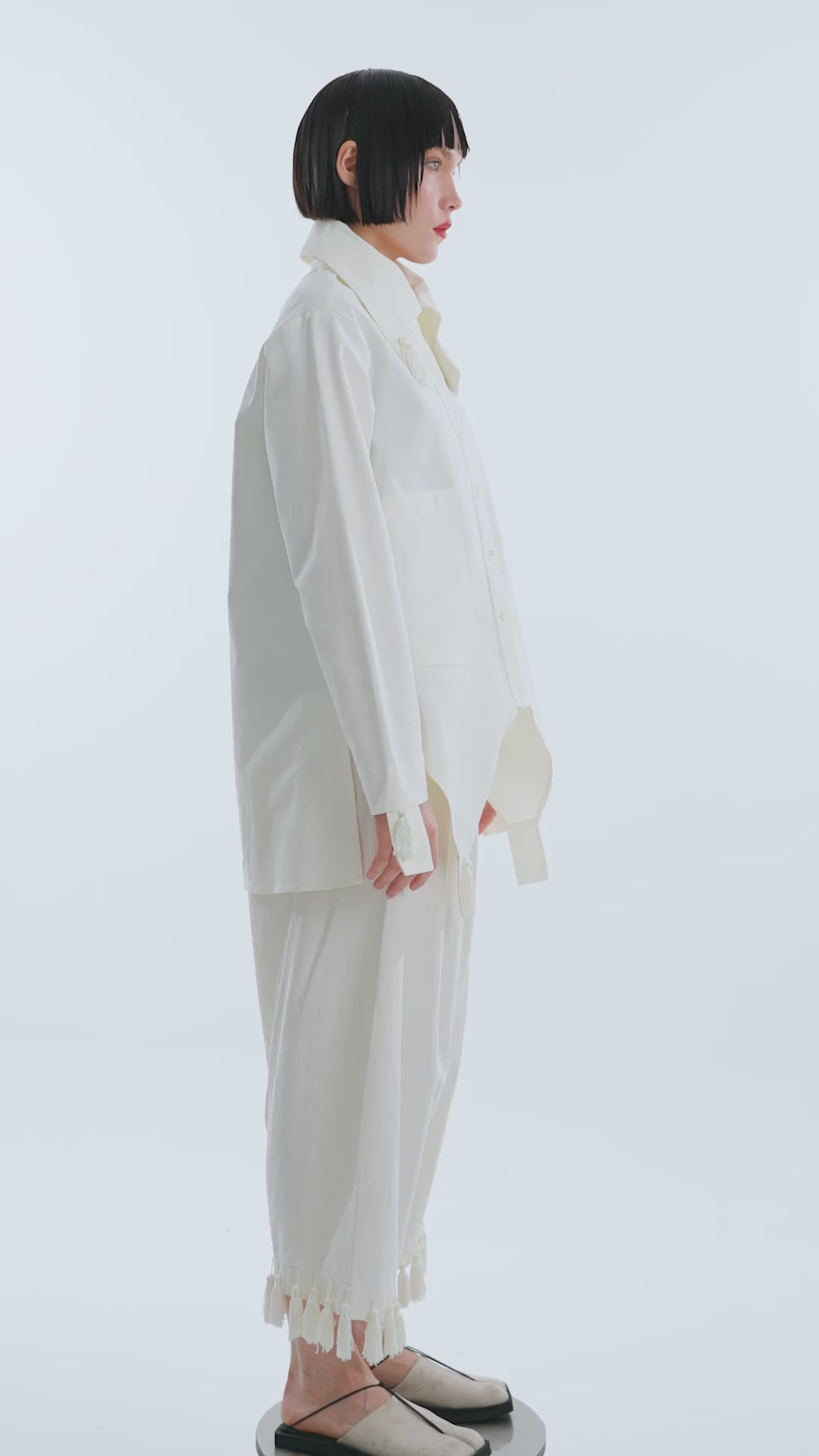 - Klasik geniş yaka, yaka ucu, manşeti ve etek ucu püsküllü, ön bitimi üçgen kesim, arka bitimi düz kesim, bol kalıp, uzun kollu, önü düğmeli, göğüs altının iki yanı cepli, gabardin gömlek.