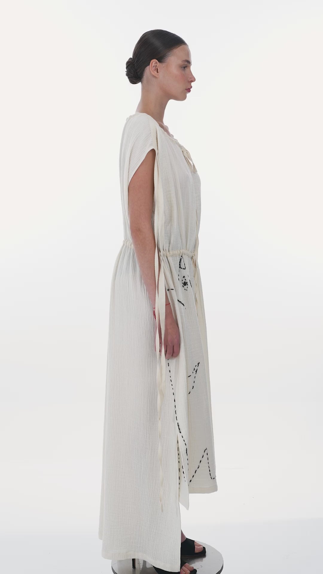 - Kısa kollu, önünün tek tarafı el işlemesi siyah dikiş detaylı, kuş motifli, yakası ve beli bağcıklı, arkası önünden uzun, iki omuzu bağcık detaylı,beli kuşaklı, önünün iki tarafı torba cepli, sırtı MiiN logo aplikeli, müslin kaftan.