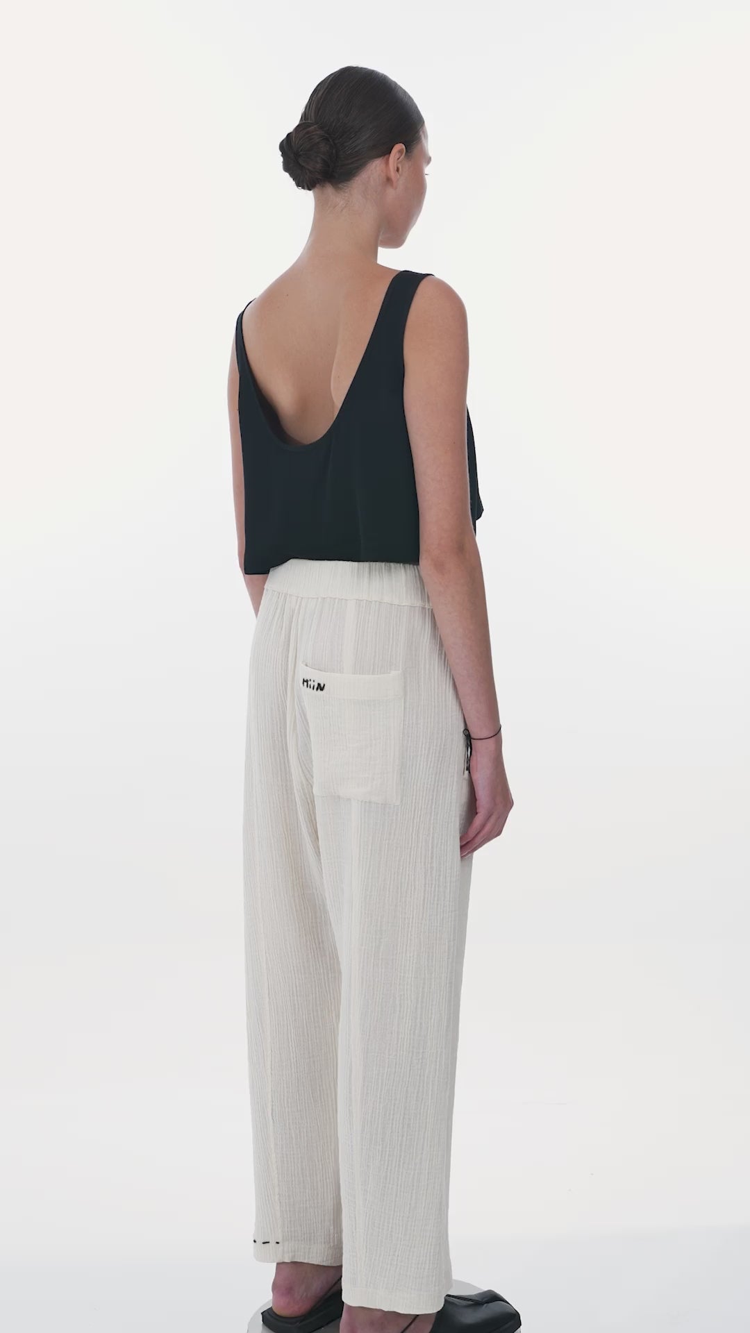 • Beli lastikli, tek paçası ve arka cebi el işlemesi siyah dikiş detaylı, müslin bol paça pantolon.