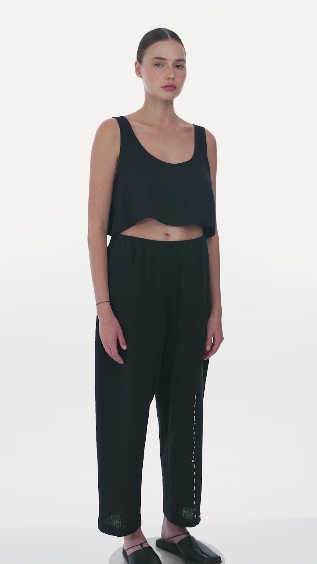 SİYAH BEYAZ DİKİŞ DETAYLI MÜSLİN BOL PAÇA PANTOLON