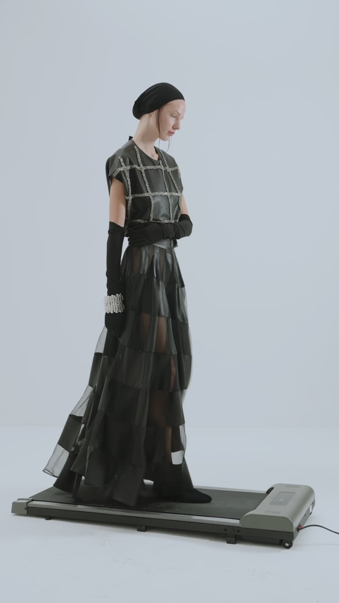 - Yüksek bel, sol yanı fermuar kapamalı, deri ve organze kumaş patchwork tasarımlı, astarlı, kloş kesim, uzun etek. İç astar ile birlikte satılmaktadır.