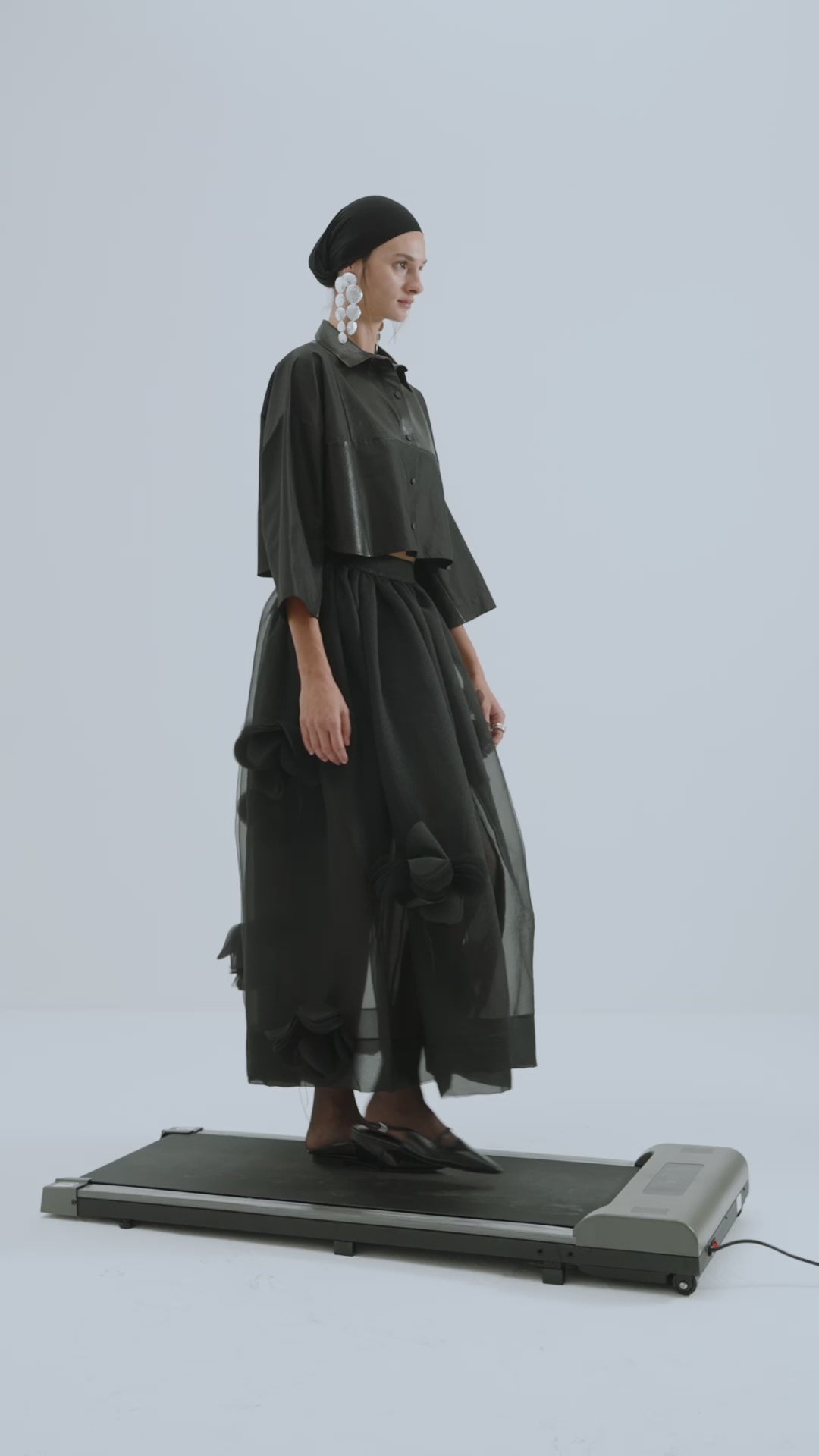 - Klasik yaka, önü çıt çıt kapamalı, tafta ve deri kumaş tasarımlı, truvakar kollu, oversize, crop gömlek.