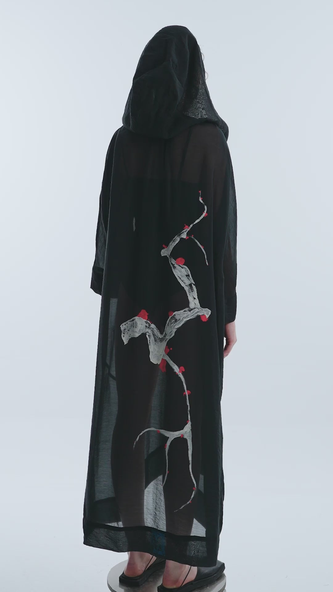 - Kapüşonlu, arkası el boyaması desenli, önü asimetirik kesim uzun kap.