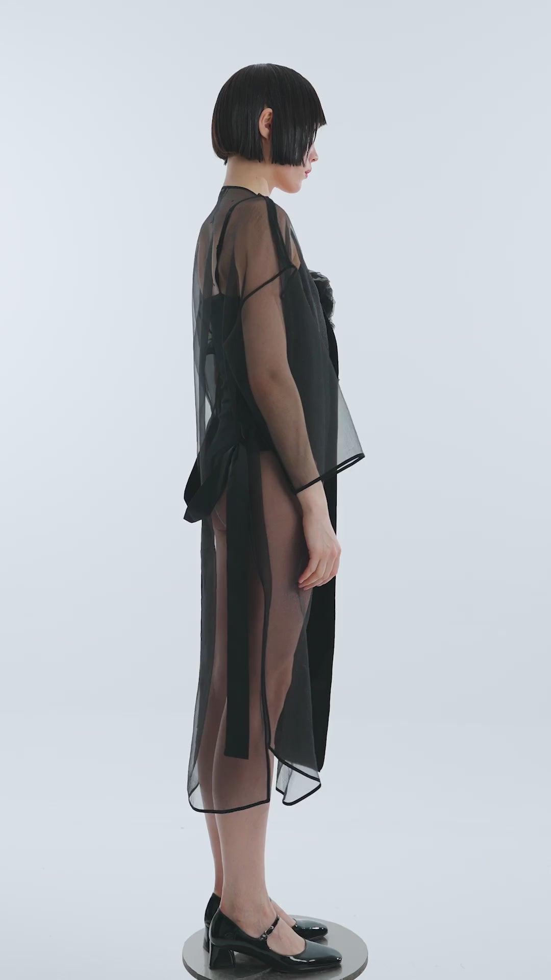 - V yaka, beli kuşaklı, önü tek taraflı tafta kumaş detaylı, organze gül aplike detaylı, transparan midi boy kap.