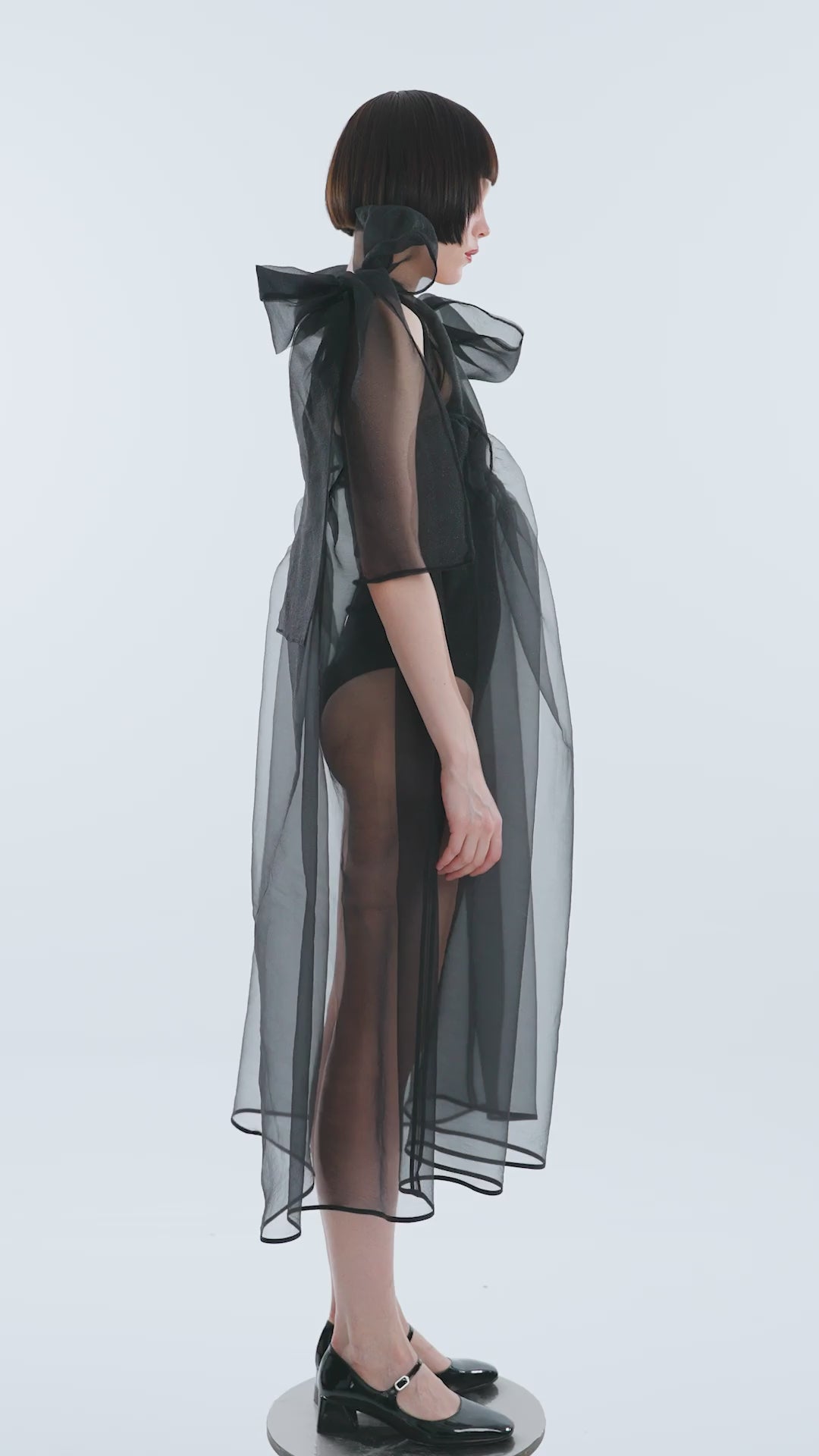 SİYAH ORGANZE TRANSPARAN FİYONKLU MİDİ BOY ELBİSE