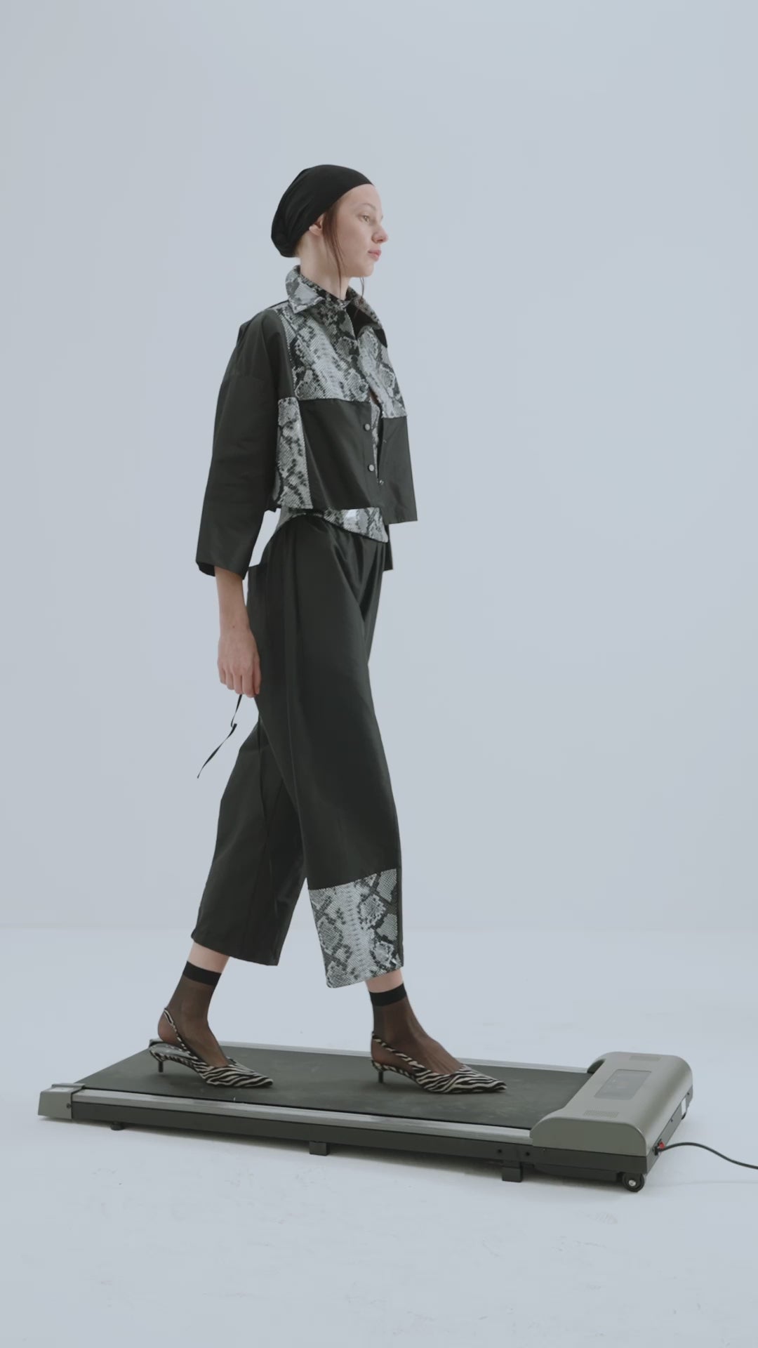 - Beli lastikli, her iki yanı cepli, her iki paçası piton baskılı deri detaylı, tek tarafı arka cepli, bol paça pantolon.
