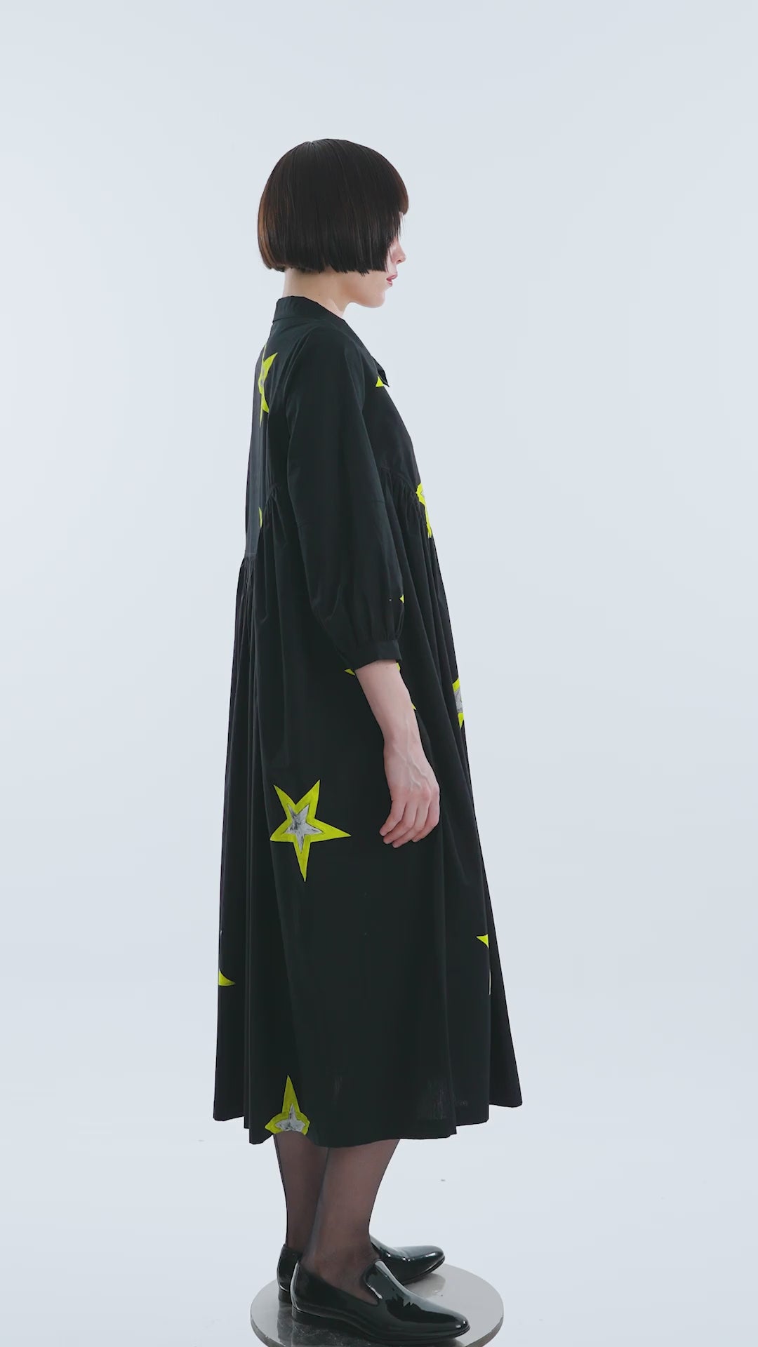 - Klasik yaka, yakası düğmeli, belden büzgü pileli, el boyaması sarı beyaz yıldız desenli, truvakar kollu, poplin midi boy elbise.